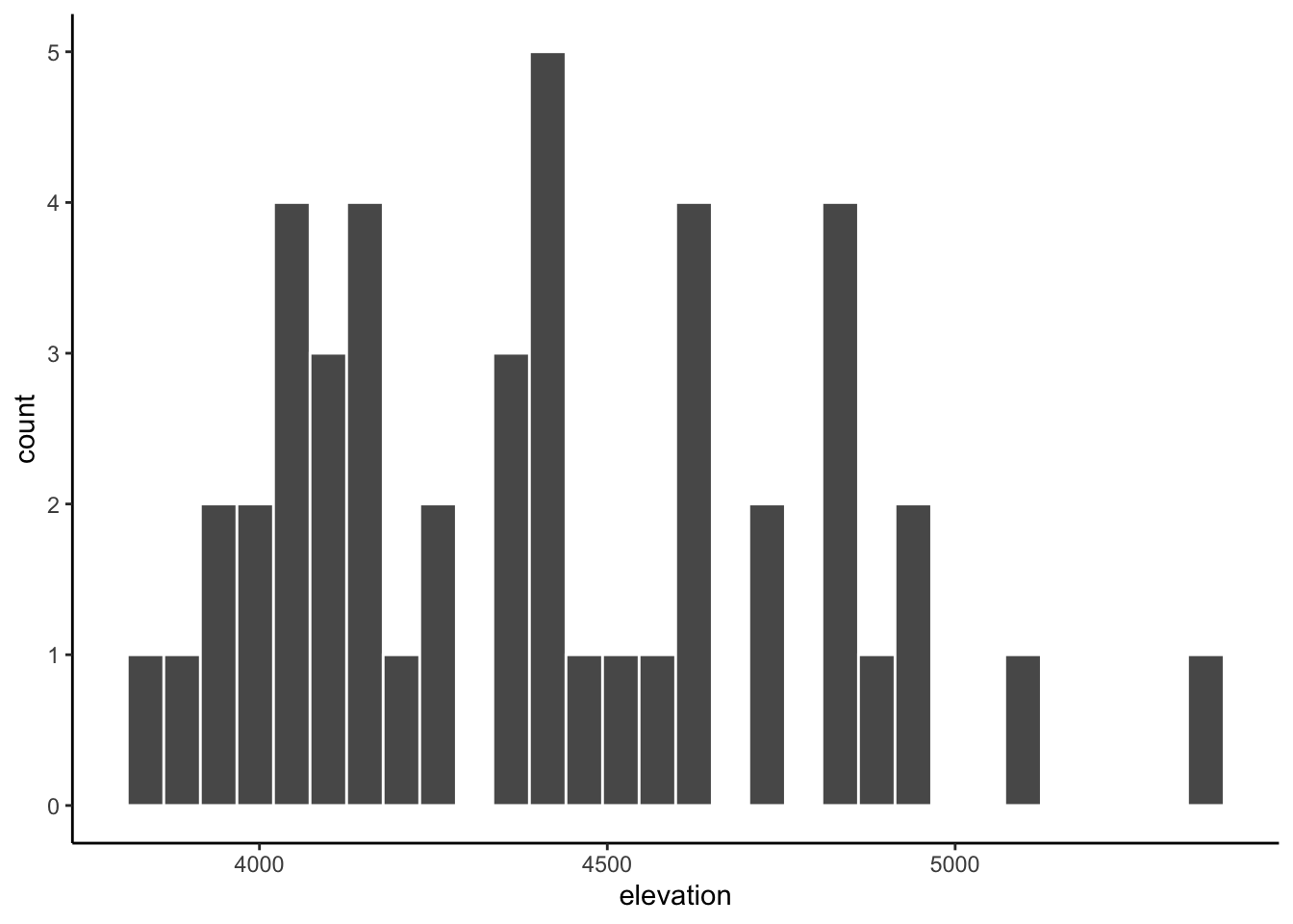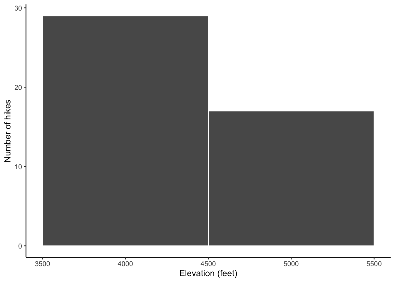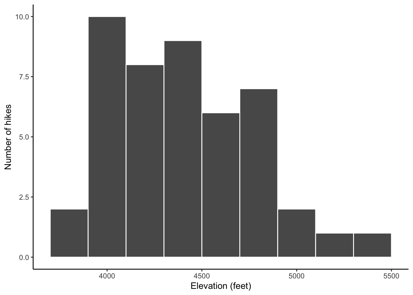 labs(x = "Elevation (feet)", y = "Number of hikes")`stat_bin()` using `bins = 30`. Pick better value with `binwidth`.