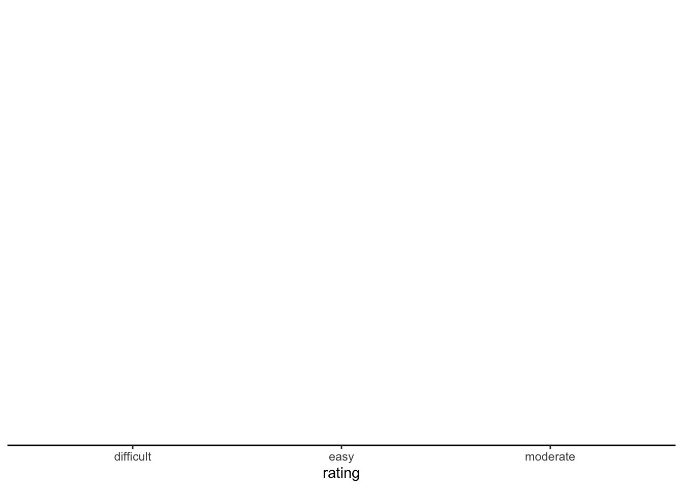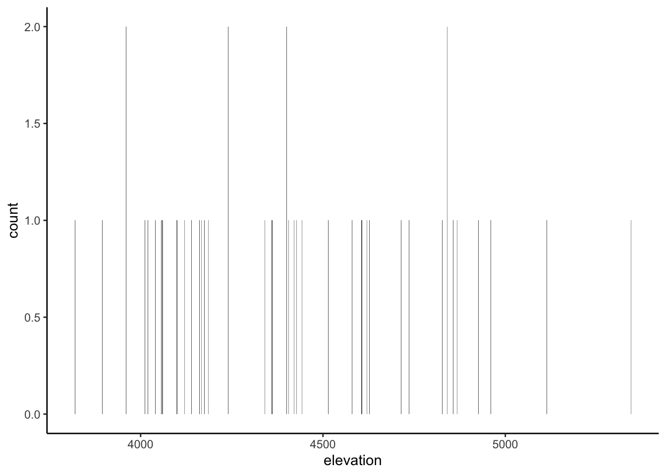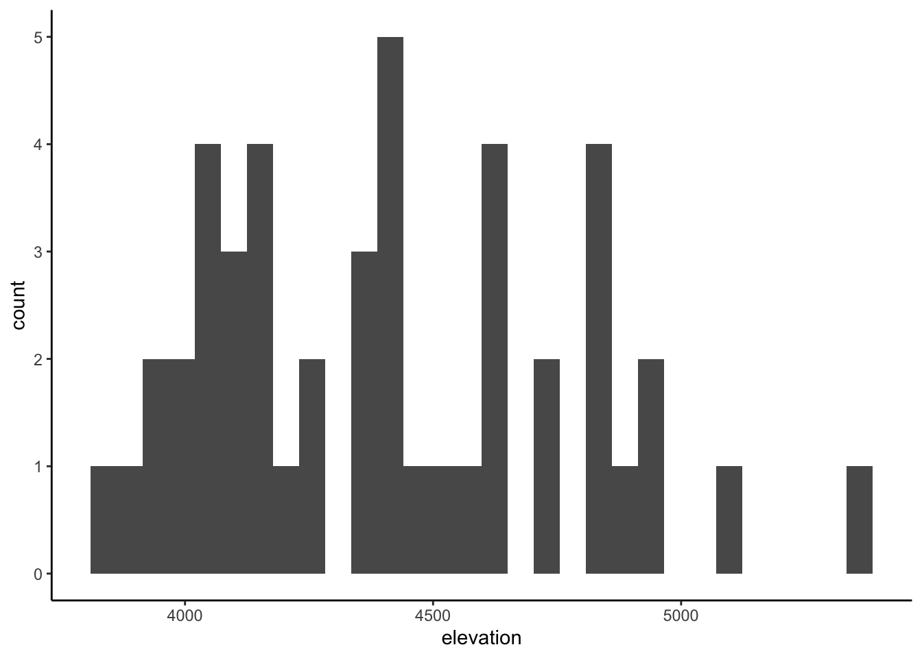 labs(x = "Elevation (feet)", y = "Number of hikes")`stat_bin()` using `bins = 30`. Pick better value with `binwidth`.
