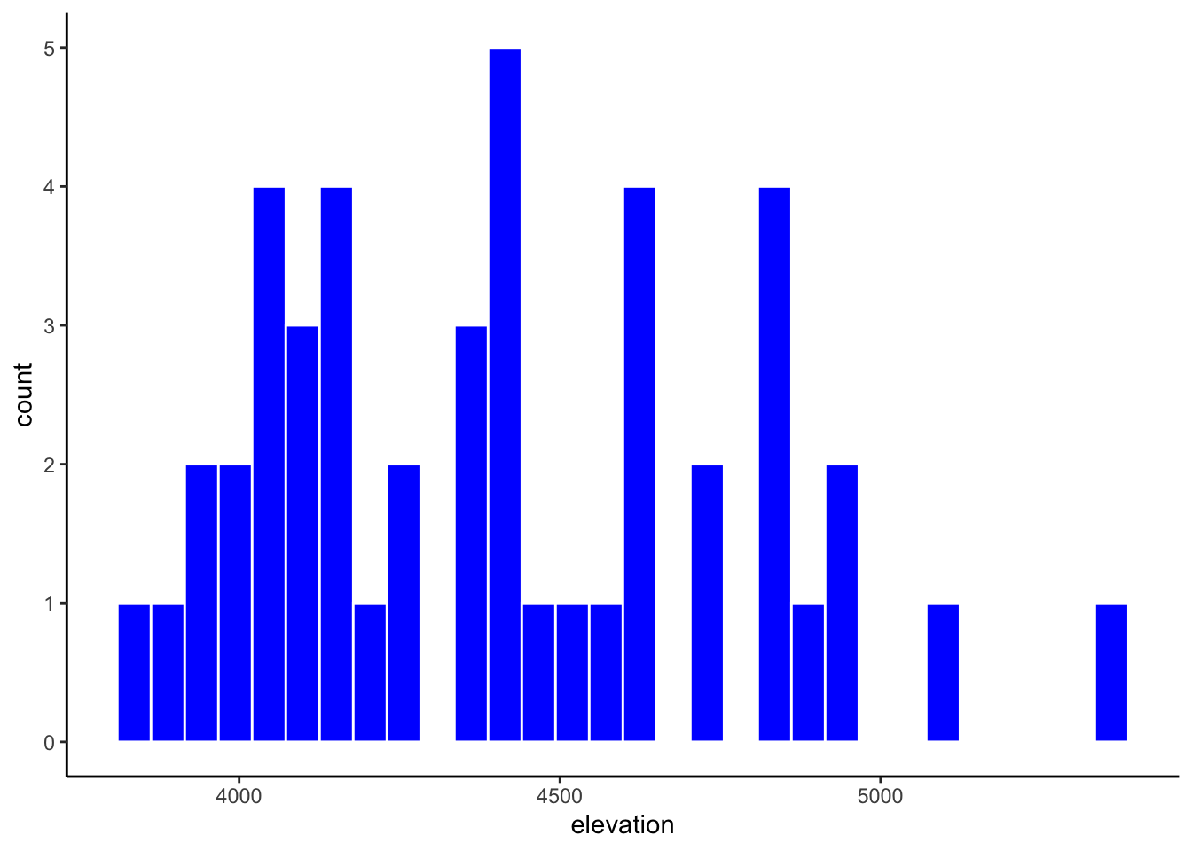 geom_histogram(color = "white", fill = "blue") `stat_bin()` using `bins = 30`. Pick better value with `binwidth`.