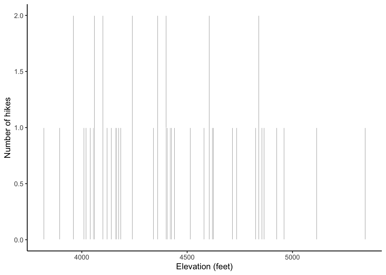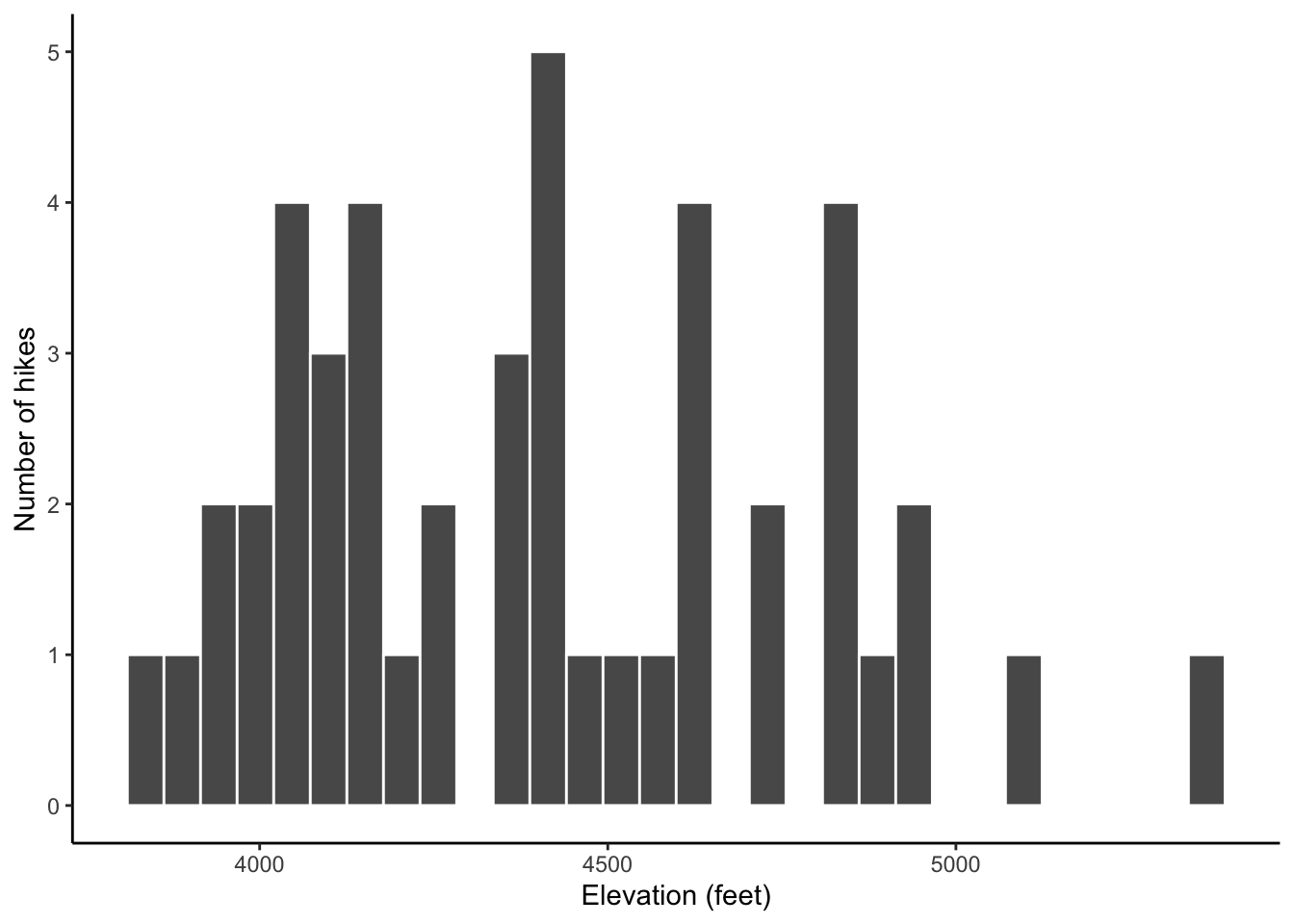 labs(x = "Elevation (feet)", y = "Number of hikes")
