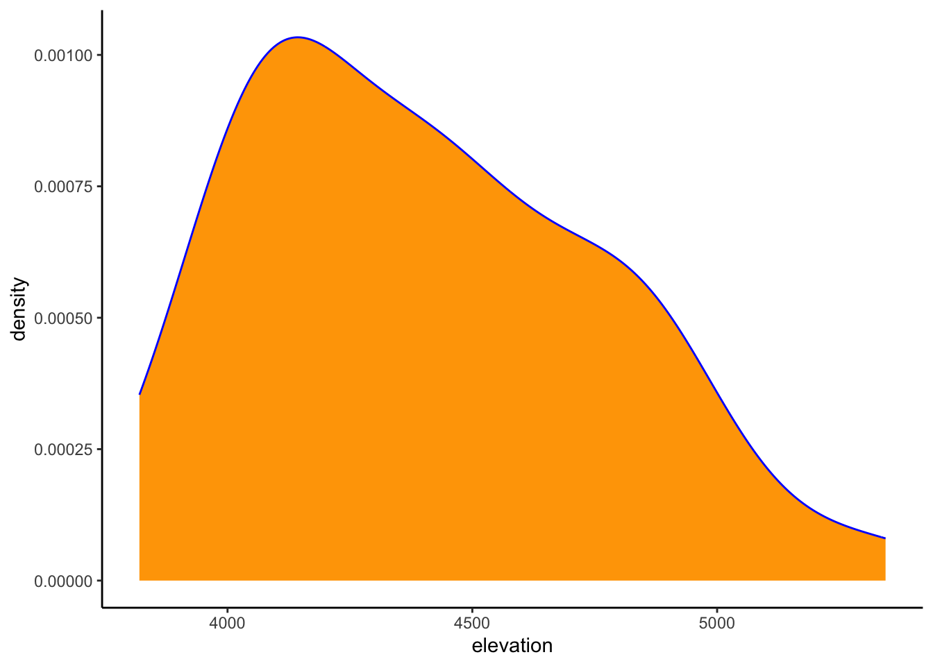 Check out a density plot of elevation. Notice that the y-axis (density) has no contextual interpretation – it’s a relative measure. The higher the density, the more common are elevations in that range.