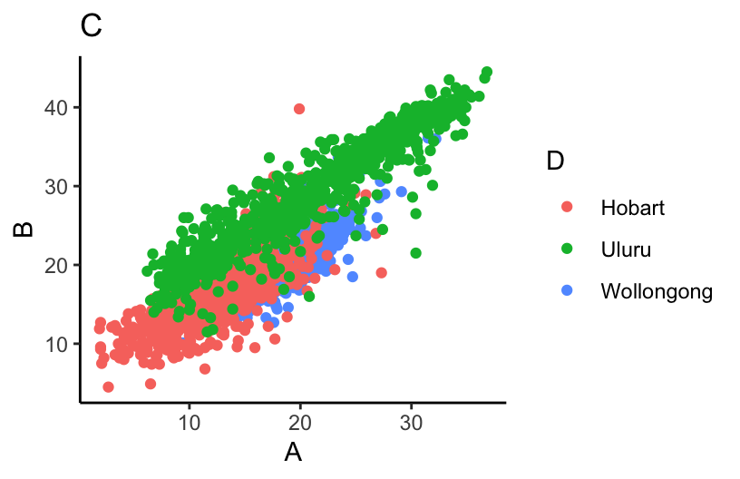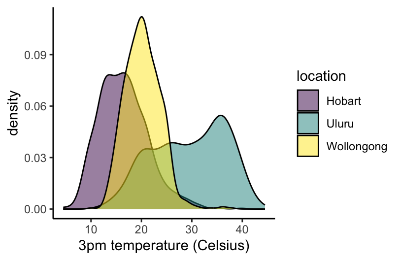 - What your visualization is (e.g. a density plot of 3pm temperatures in Hobart, Uluru, and Wollongong, Australia).