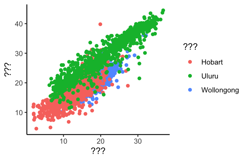 ggplot(weather, aes(y = temp3pm, x = temp9am, color = location)) +