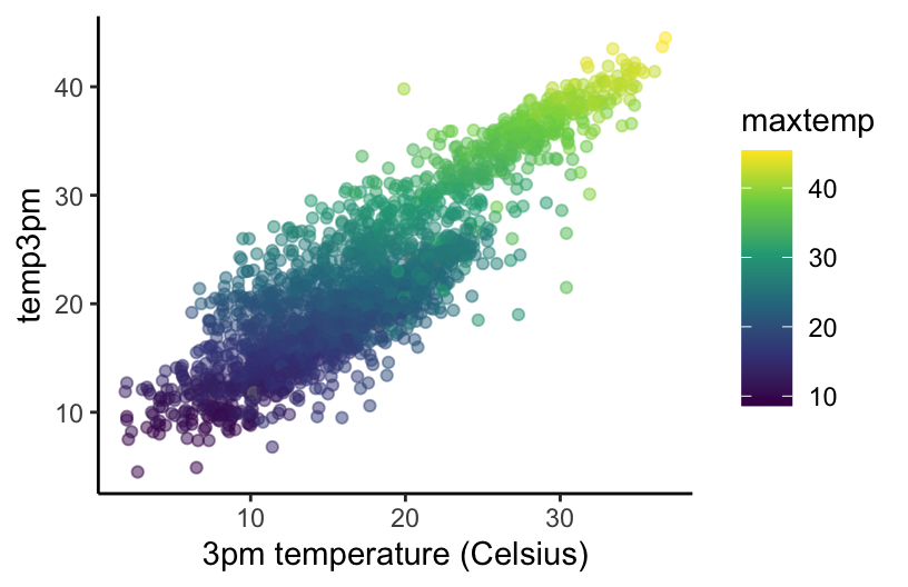 ggplot(weather, aes(y = temp3pm, x = temp9am, color = maxtemp)) +