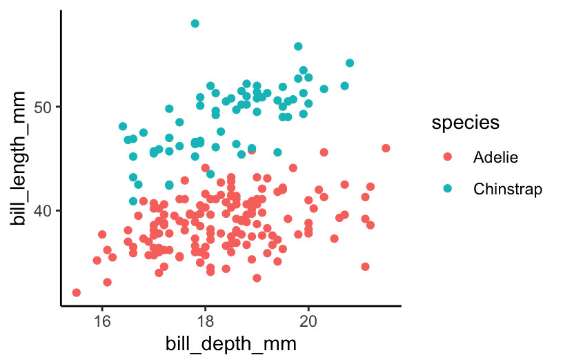 ## 2 Chinstrap 68# Create a dataset with just Adelie and Chinstrap using !=