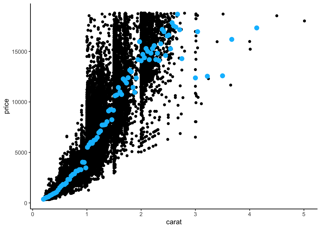 geom_point(data = diamonds_avg_price, aes(x = carat, y = avg_price), color = "deepskyblue", size = 3)