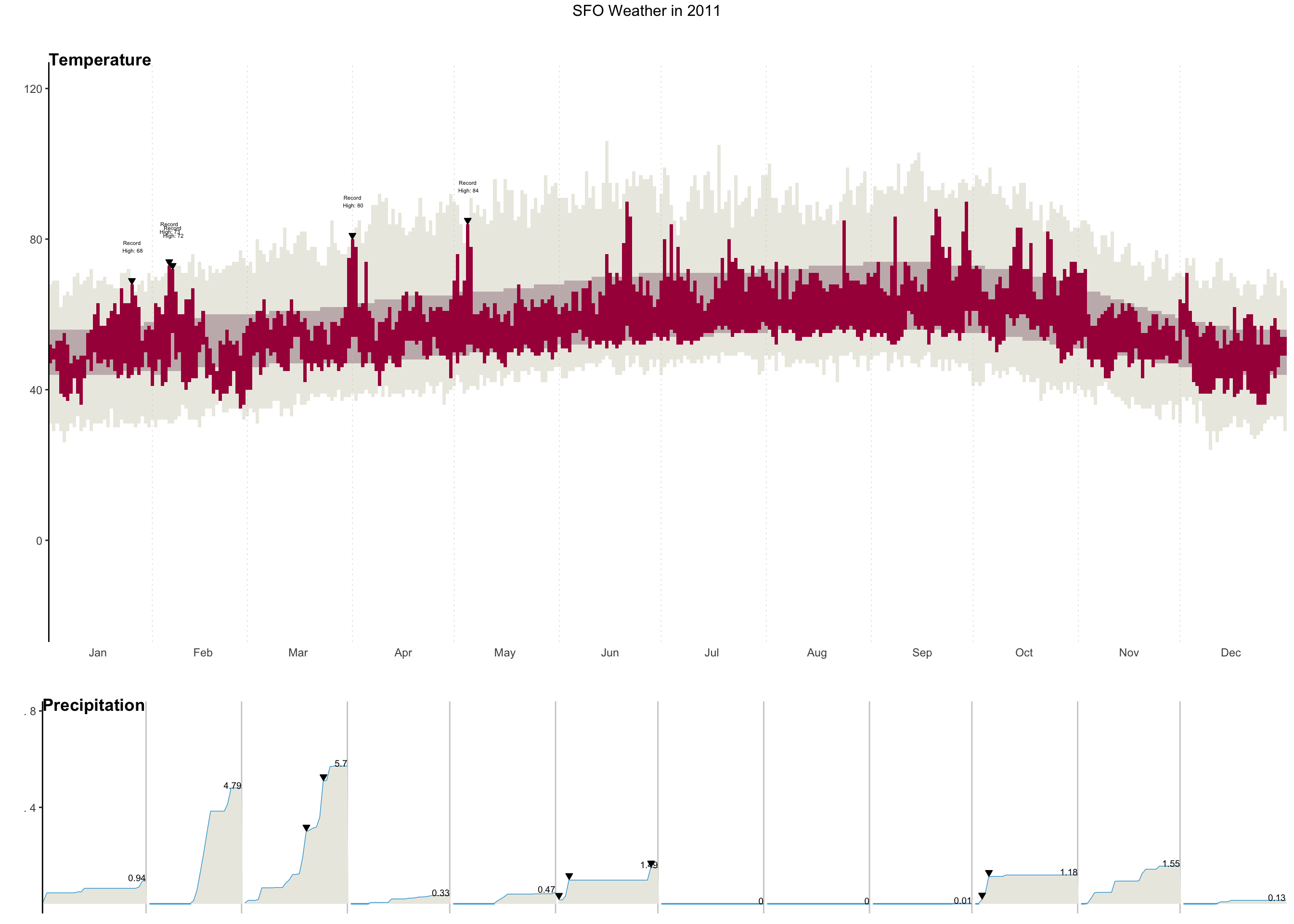 We are going to recreate this NYT visualization on record setting temperatures by expanding our ggplot2 toolbox using data from San Francisco (SFO) in 2011.