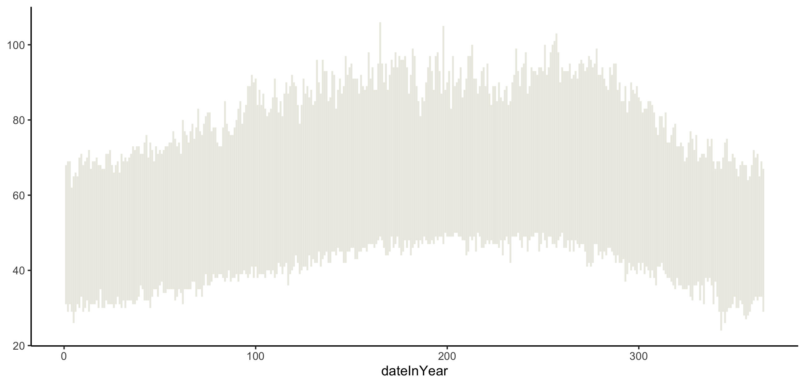 We can use the same process to look at the geom_linerange documentation page and start off our temperature visualization with the record lows and highs (light tan color: #ECEBE3):