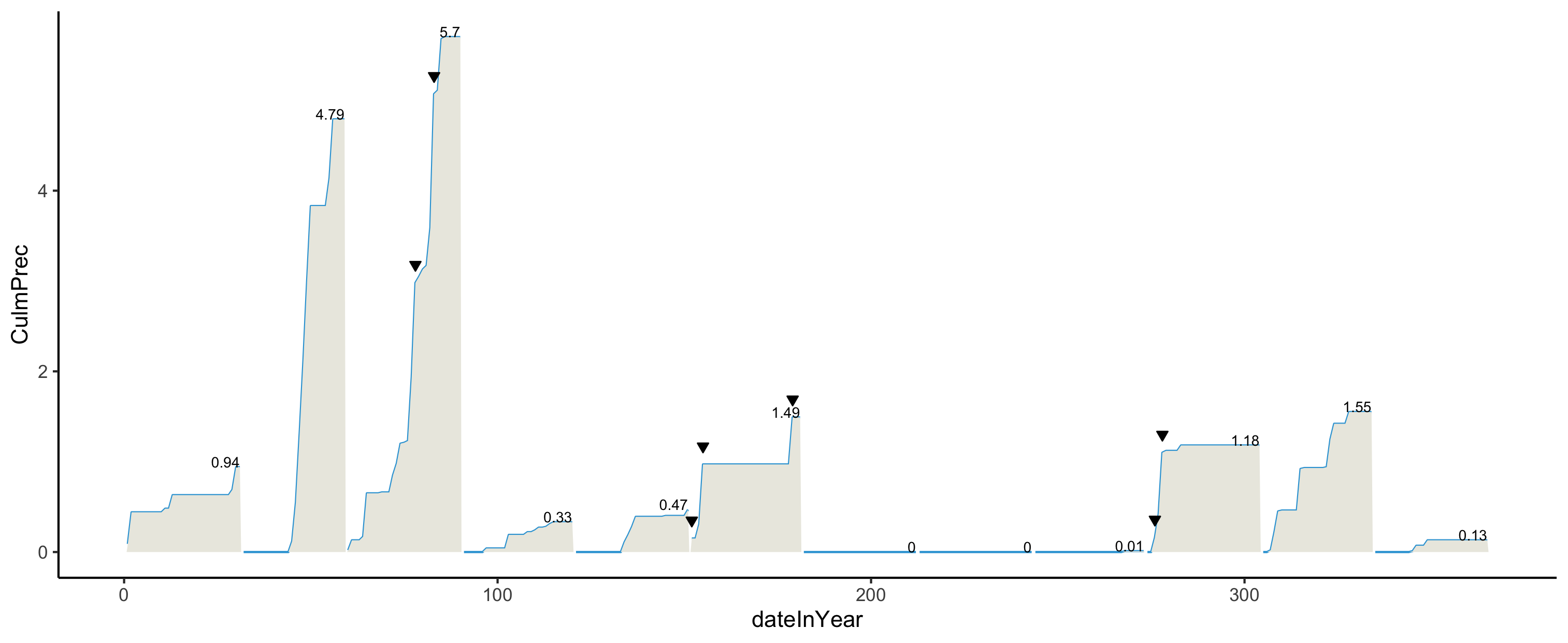 - The triangles point to precipitation records. Refer to the Data Codebook above for the
