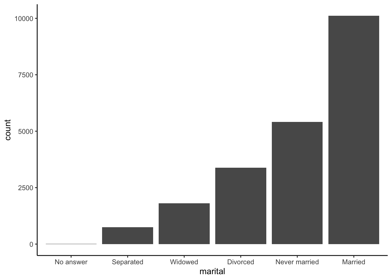 We’ll use a subset of the General Social Survey (GSS) dataset available in the forcats pacakges.