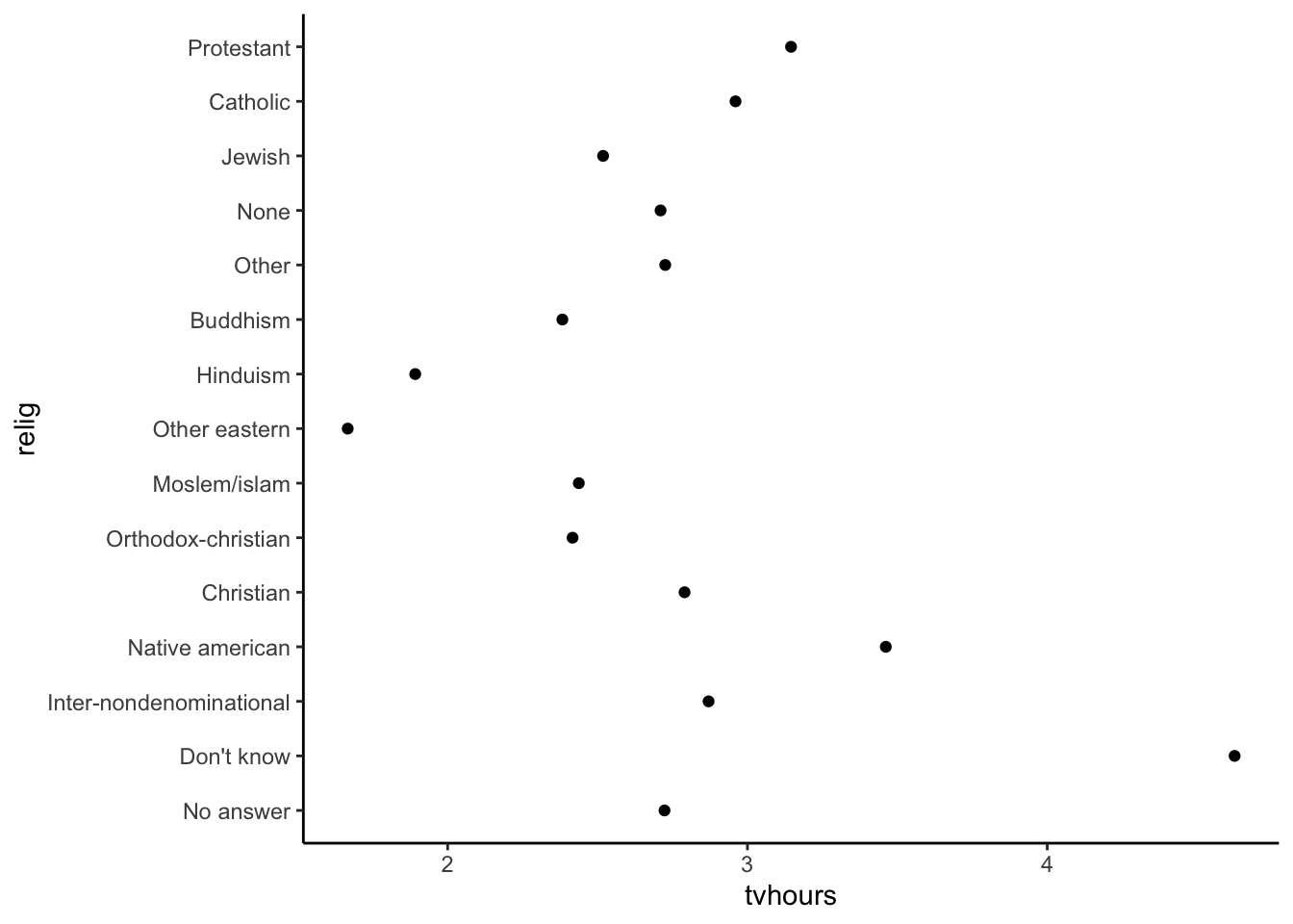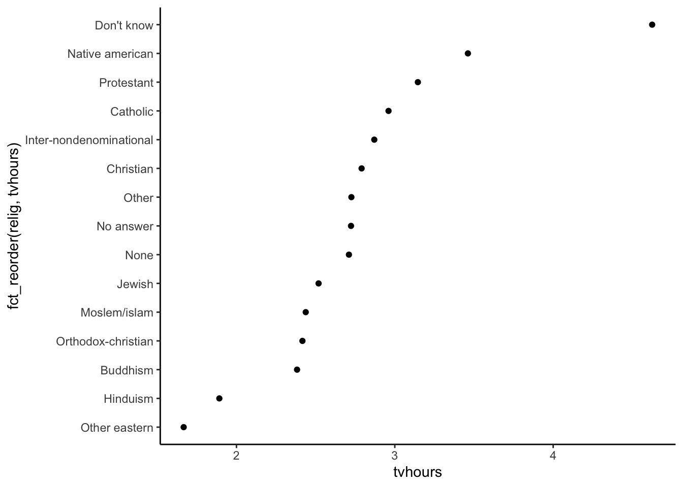 ggplot(relig_summary, aes(x = tvhours, y =fct_reorder(relig, tvhours))) +geom_point() +theme_classic()