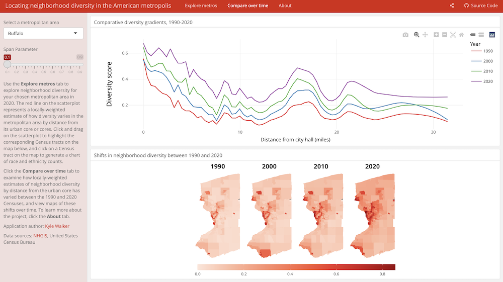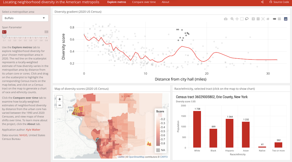 This interactive application made by Kyle Walker allows exploration of neighborhood diversity across time and space. It showcases major packages and features of interactive visualization.